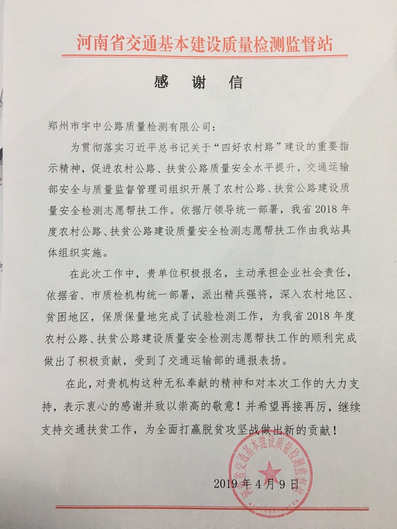 4月22日,質(zhì)檢中心收到了一封來自河南省交通基本建設(shè)質(zhì)量檢測監(jiān)督站的感謝信,感謝質(zhì)檢中心在促進農(nóng)村公路、扶貧公路質(zhì)量安全水平提升等方面做出的積極貢獻。
